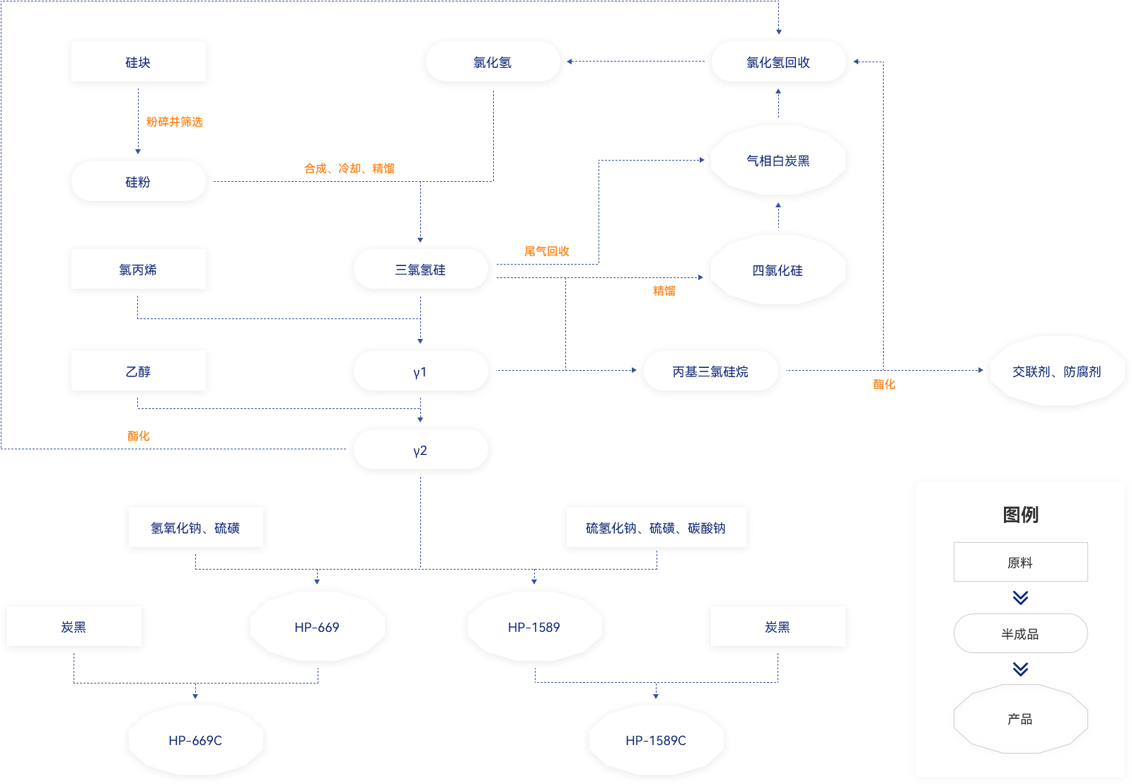 公司通過技術改造成為業內率先完成硅烷生產鏈閉鎖循環的公司。形成了從基礎原料工業硅到三氯氫硅、γ1、γ2等中間體,再到含硫硅烷的完整產業鏈布局,實現了對產品品質和成本的有效管控。對于生產過程中產生的副產物四氯化硅,公司將其加工處理為氣相白炭黑后對外出售;副產物氯化氫也已實現循環使用。通過硅烷生產鏈的閉鎖循環,公司不僅免除了對氫氣和氯氣的采購需要,提高了物料使用效率,也減少了生產過程中的“三廢”排放,實現了更好的經濟和環境效益。